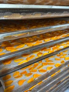 5. Loading and Drying: The prepared mango pieces are spread evenly on trays and loaded into the 1500KG capacity dryer. Drying is conducted at low temperatures, typically between 50°C and 65°C (122°F – 149°F). Precise humidity control is crucial to remove moisture effectively without case-hardening.